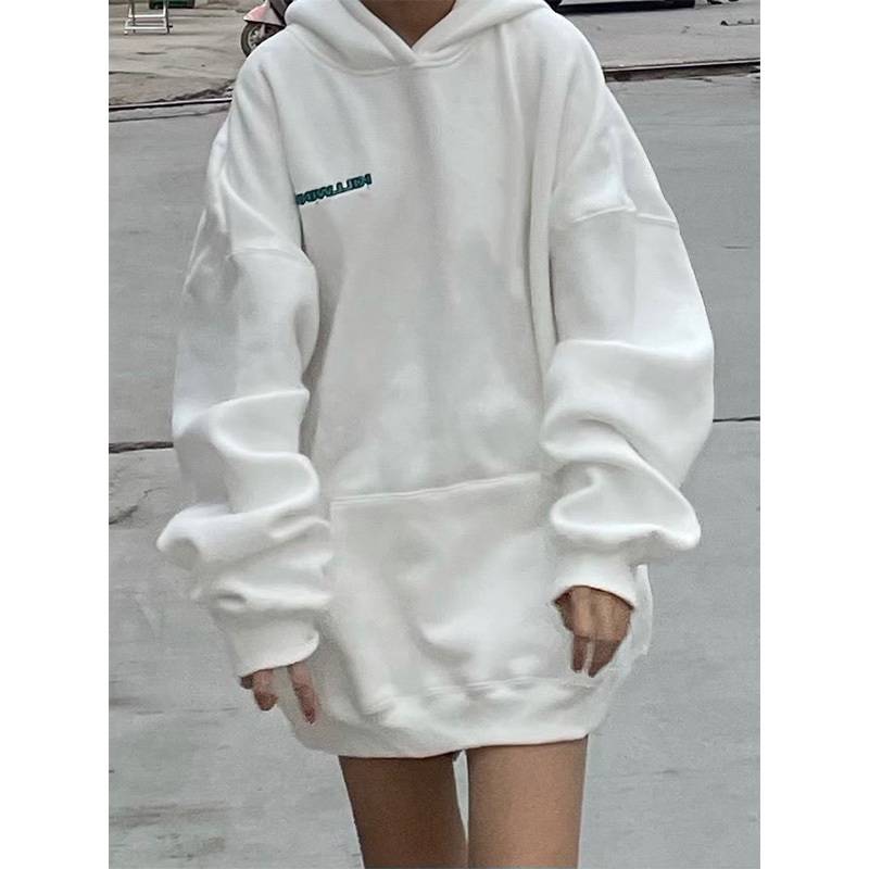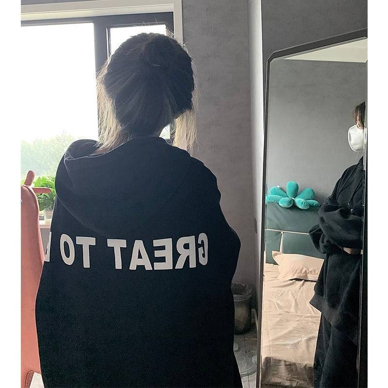 港风复古黑色连帽卫衣女秋冬宽松韩版ins潮加绒加厚oversize外套