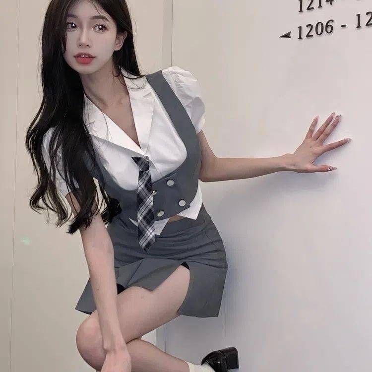 三件套学院风纯欲辣妹套装女夏季白色领带衬衫西装马甲包臀半身裙