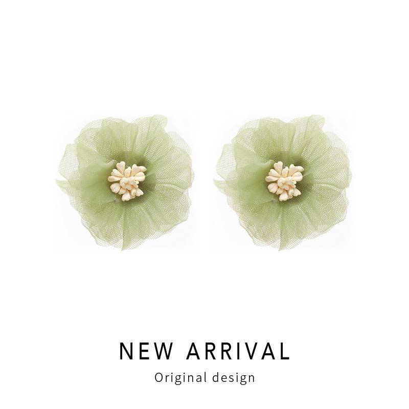 日韩复古橄榄绿花朵耳钉唯美清新雪仿纱耳环无耳洞耳夹女夸张耳饰