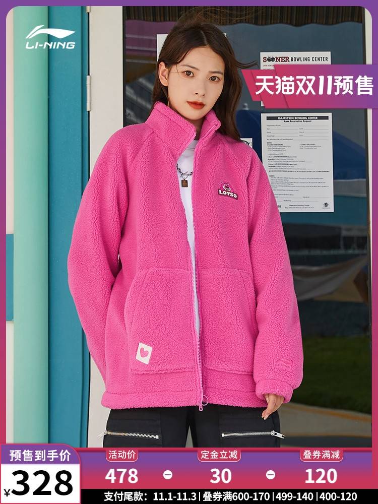 李宁迪士尼玩具总动员草莓熊外套男保暖羊羔绒上衣女