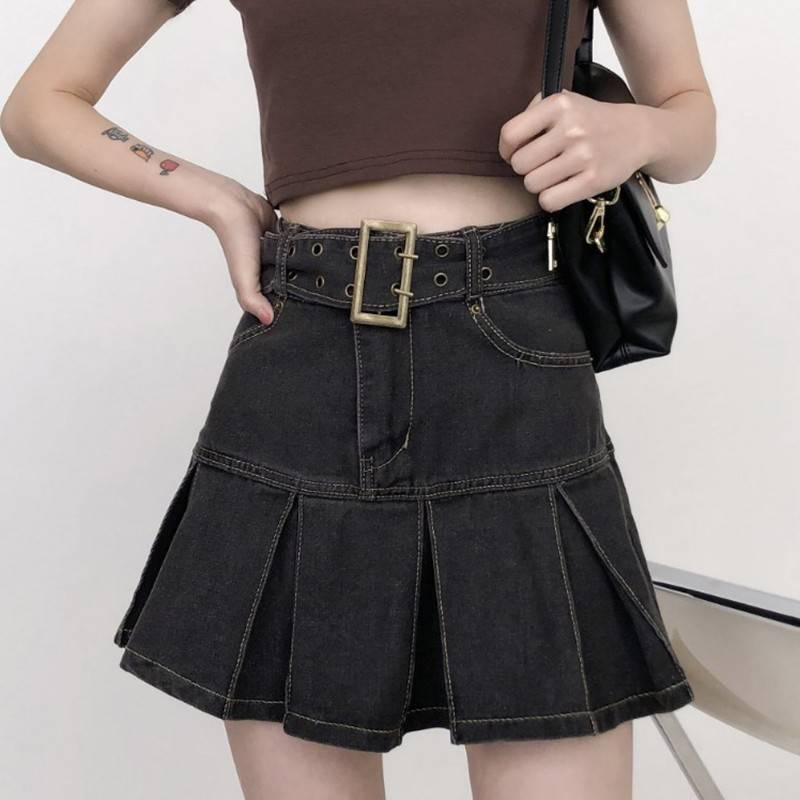 复古牛仔辣妹短裙女夏a字裙2022新款大码胖mm高腰显瘦百褶半身裙
