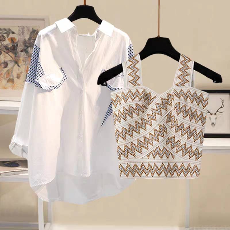 小清新夏季三件套装女翻领中长款衬衫 条纹背心 开叉修身牛仔裤潮