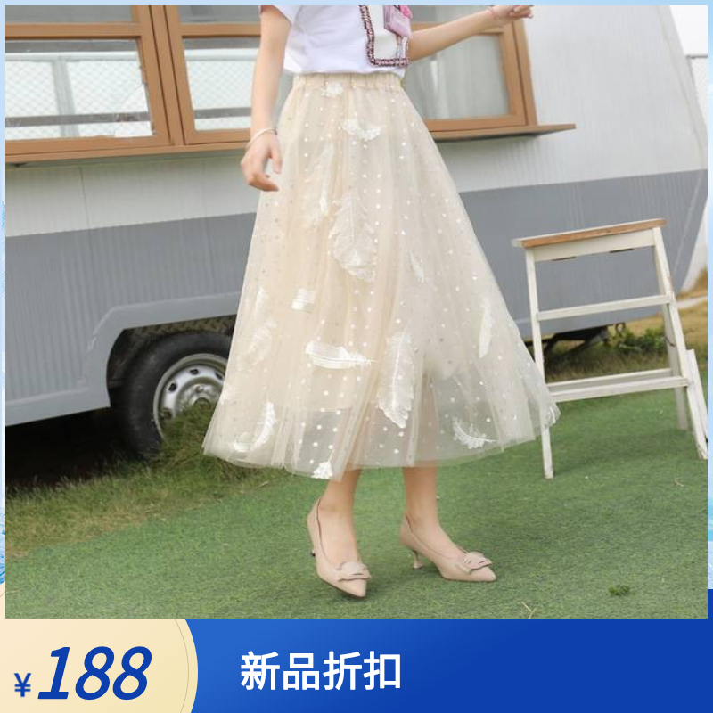 很仙的羽毛刺绣网纱半身裙 2020春季新款高腰显瘦中长款仙女裙