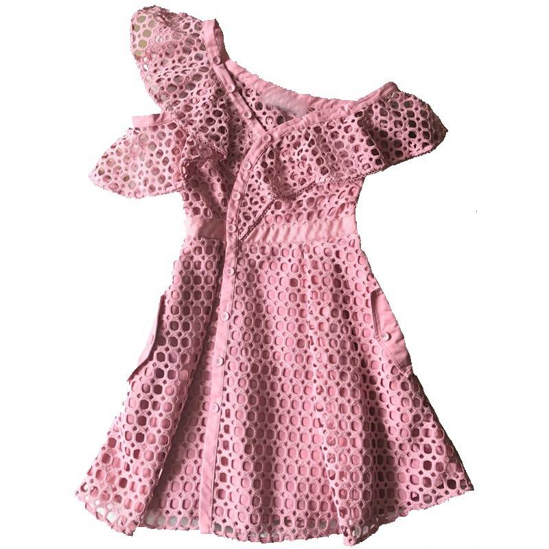 2018年秋装新款女装 粉色蕾丝性感迷人斜肩收腰连衣裙显瘦小洋装