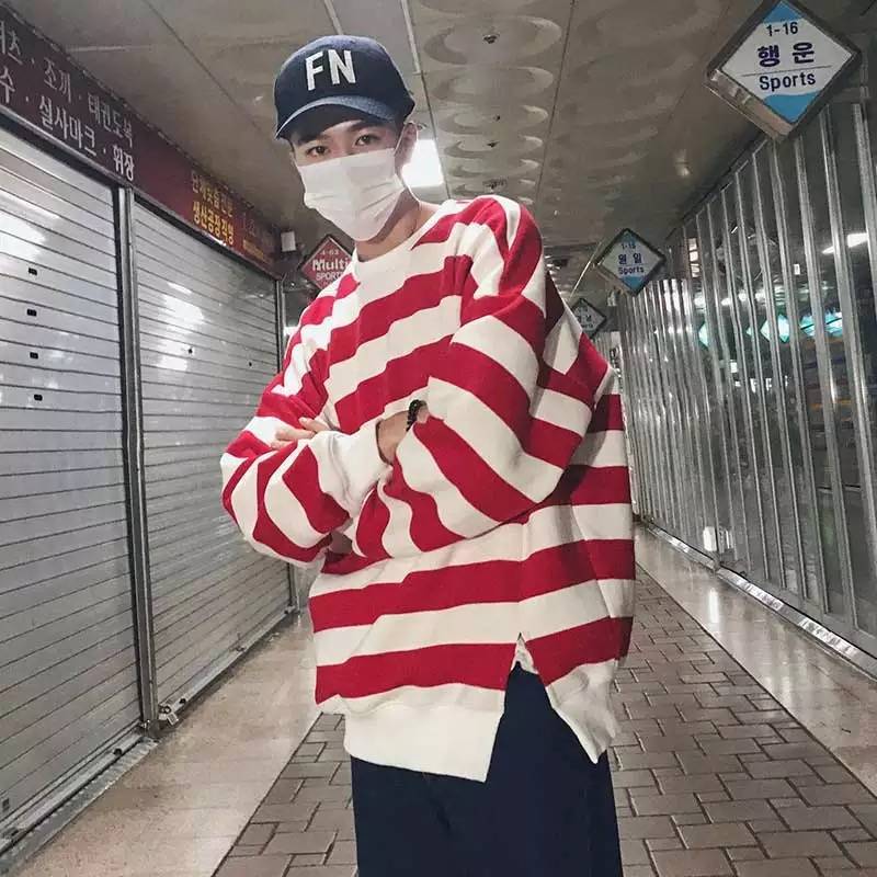 秋季男士长袖T恤韩版宽松卫衣ins超火的港风 上衣秋装条纹衣服
