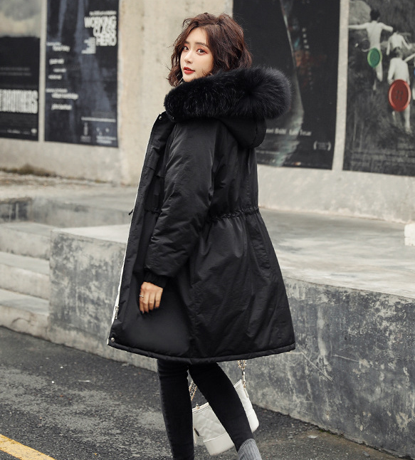 棉衣女中长款2018新款冬季加厚仿真大毛领棉服系带派克服棉袄外套