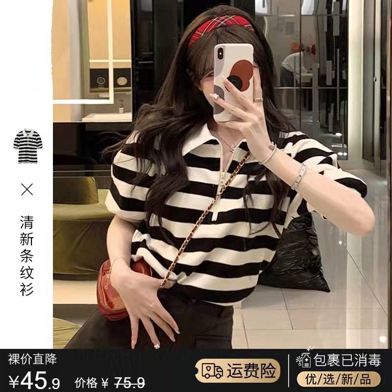 包邮2022年新款美式复古条纹短袖polo领拉链正肩t恤别致上衣女夏