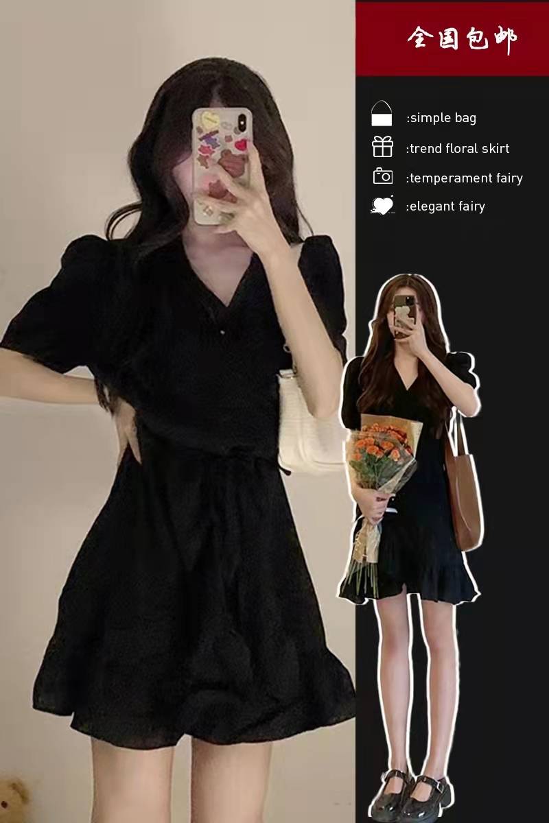 全国包邮2022夏季新款小个子法式连衣裙小众小黑裙收腰显瘦