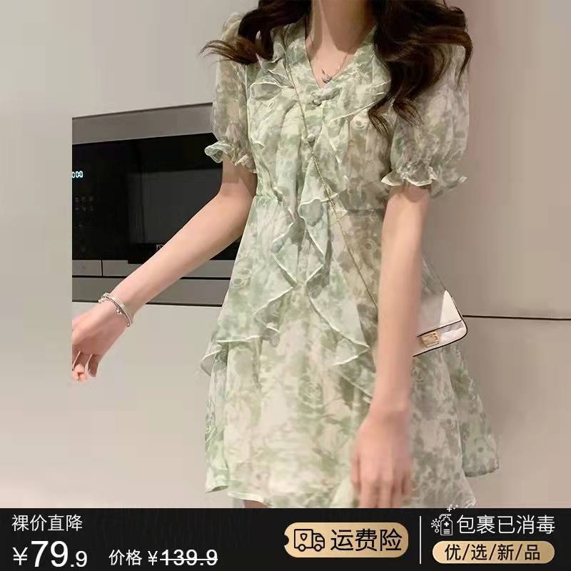 全国包邮2022年新款设计感法式泡泡袖雪纺碎花连衣裙女夏季长裙