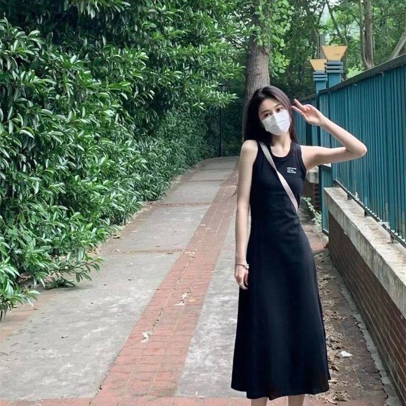 2022新款小个子学院运动风连衣裙女休闲黑色无袖背心大裙摆长裙夏
