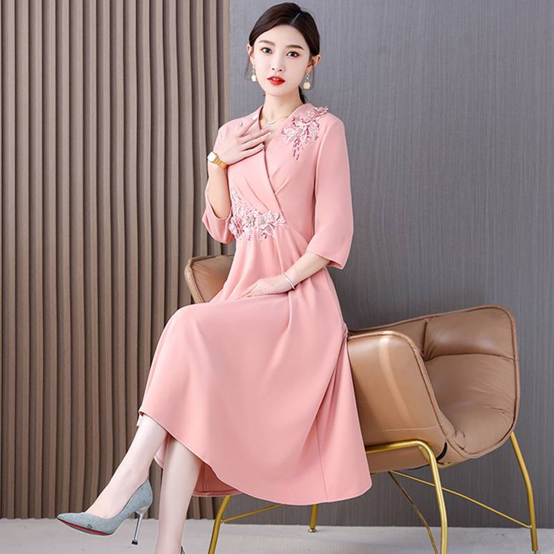 年轻妈妈春季连衣裙婚礼喜婆婆婚宴礼服高贵洋气平时可穿结婚新款