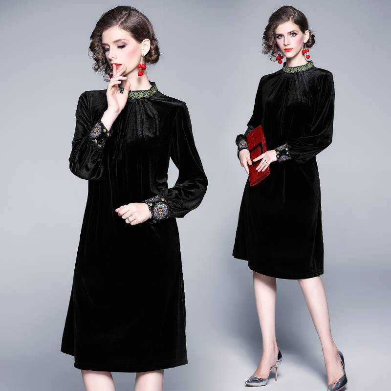 实拍 秋冬新款 复古名族风刺绣丝绒裙 大码女装长袖连衣裙