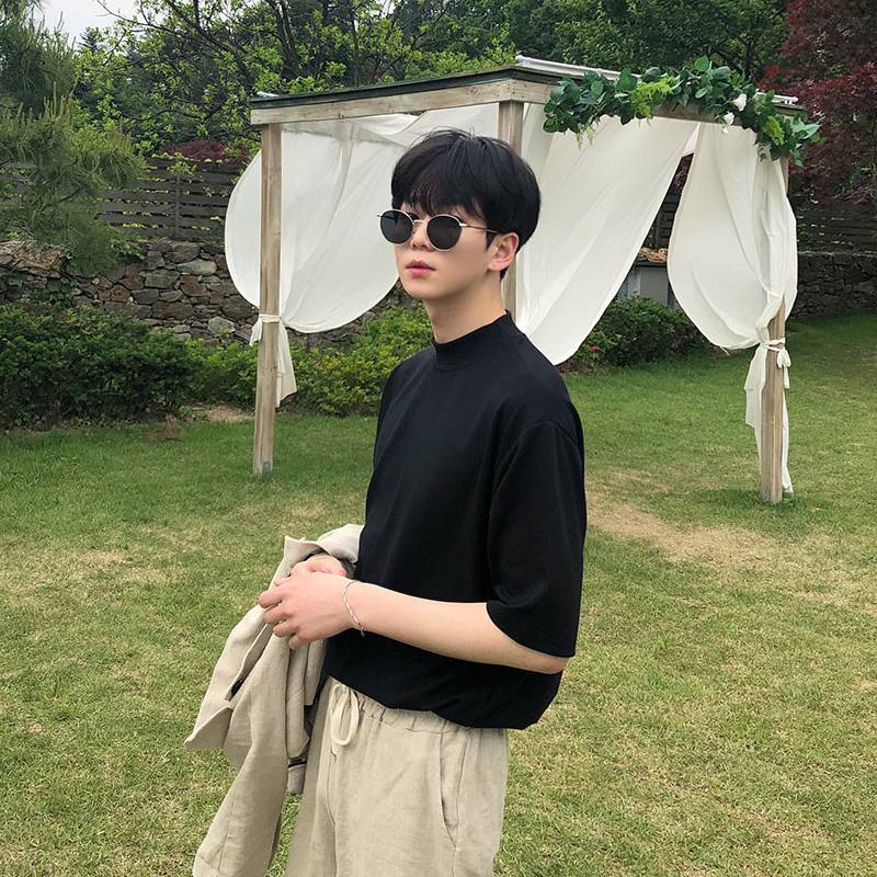 短袖t恤2020韩版百搭ins潮流夏天男士黑色半袖立领半高领纯色纯棉