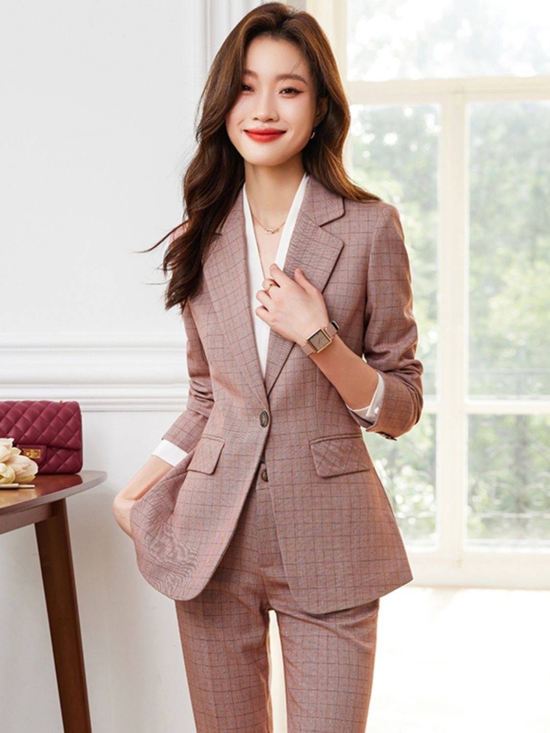 香槟色格子西装外套女秋季新款职业装气质正装大学生面试西服套装204年