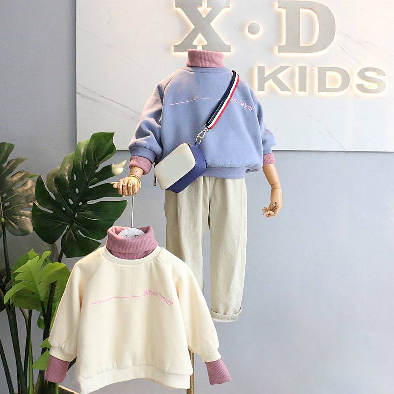 中小童童装2018女童高领抓绒宝宝卫衣冬季新款字母儿童休闲上衣潮
