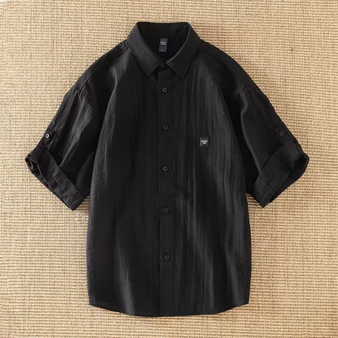 青年男式短袖衬衫25春季男装纯黑色时尚开衫潮流衬衣男款