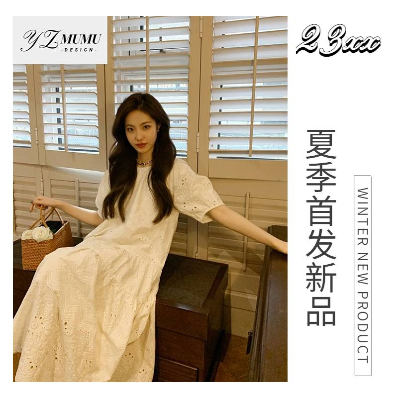 2023年样子木木夏季新款绣花纯棉中长袖雪纺下摆刺绣长款连衣裙女