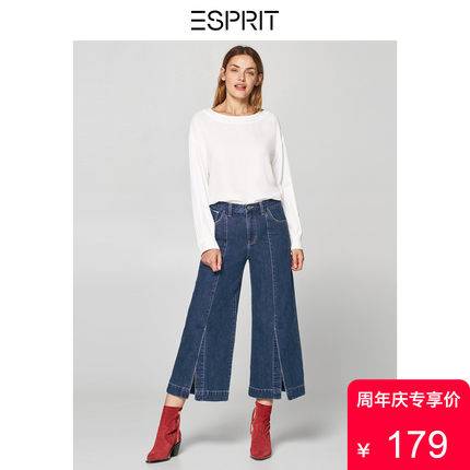 ESPRIT 女装秋纯棉水洗宽松开叉阔腿裤休闲牛仔裤女