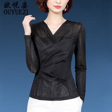 秋季中年女士长袖薄款上衣纯色网纱打底衫春秋新款35岁45时尚小衫