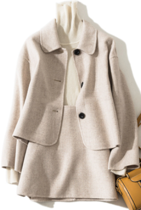 春秋短款小个子双面呢纯羊毛大衣女西装格子套装短裙外套羊绒