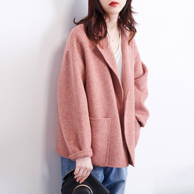 粉色毛呢格子小外套短款春装小个子双面羊绒羊毛大衣女
