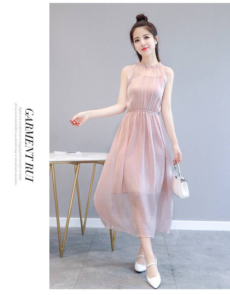 粉色无袖雪纺连衣裙中长款夏季新款女装韩版时尚修身裙子长裙