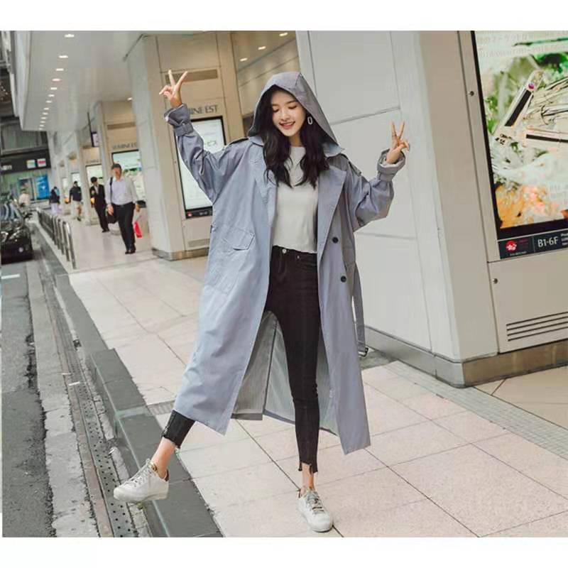 韩版连帽风衣女中长款 内搭2019初秋流行 薄款垂感百搭外套,浅蓝色 L