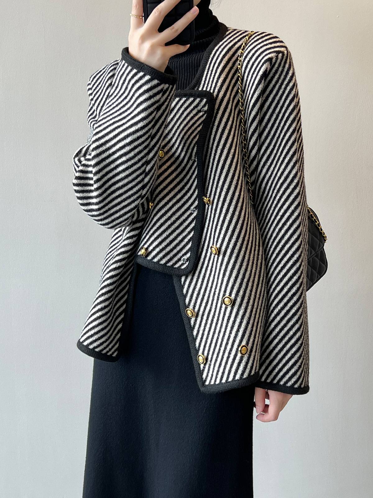 针织毛衣女秋冬新款女装撞色宽松长袖加厚V领开衫外套女
