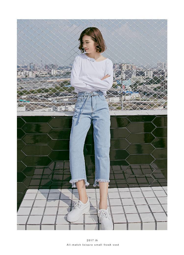 2018秋冬新款腰带高腰阔腿裤韩版潮流不规则直筒毛边女式牛仔裤