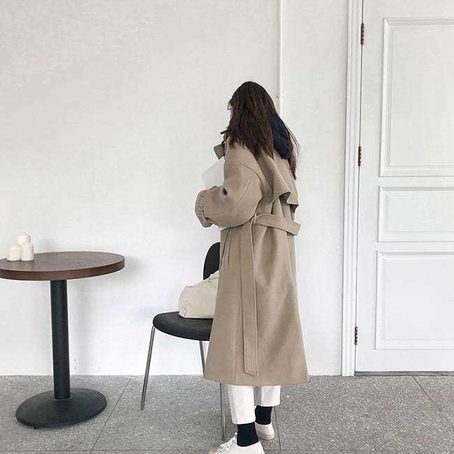 2018冬季韩版翻领系带收腰中长款大衣外套风衣女装
