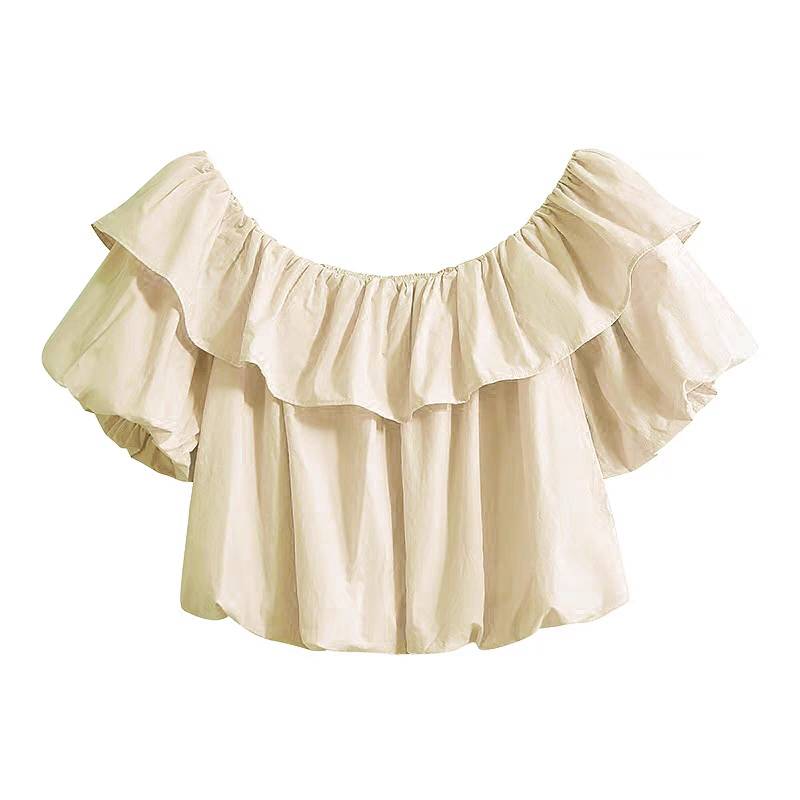 现货短袖t恤女夏法式温柔气质性感露肩荷叶边一字肩上衣
