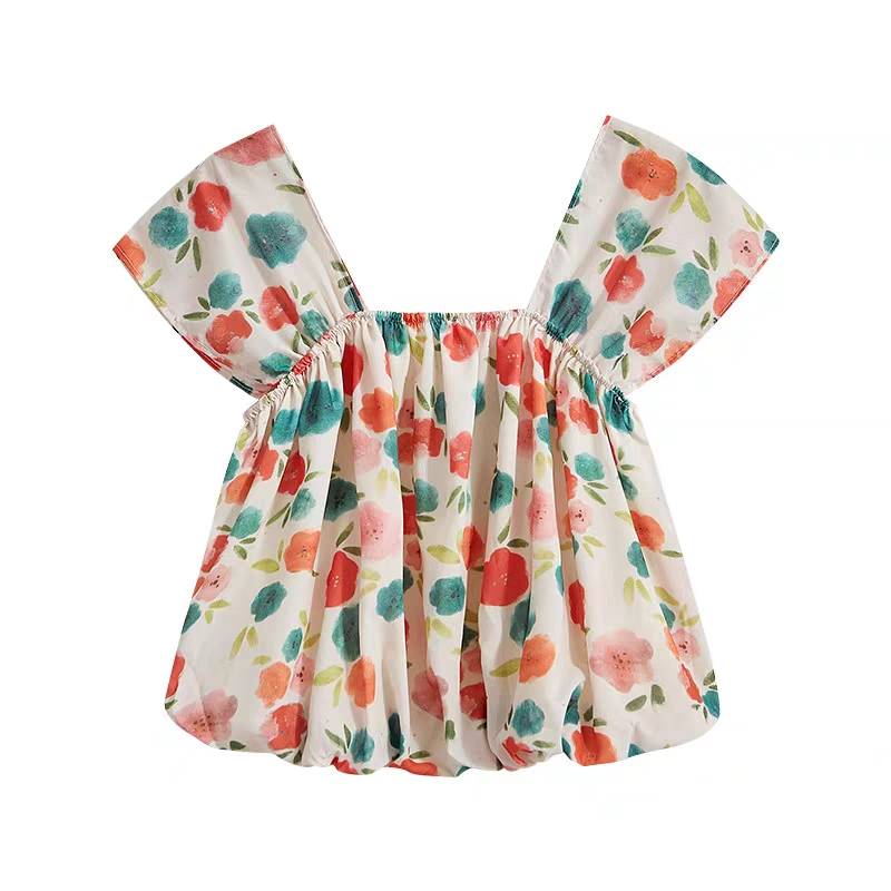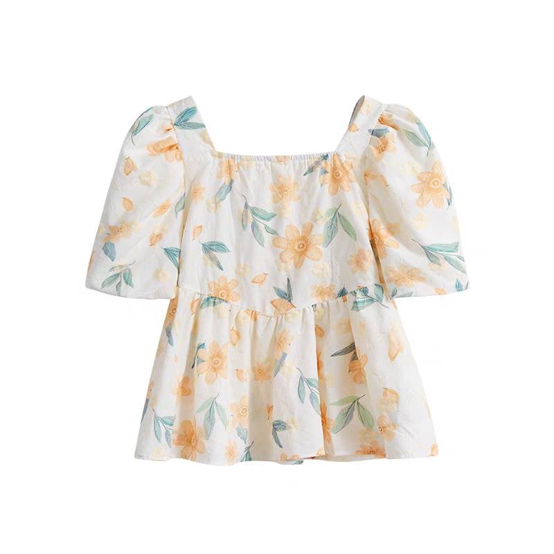 现货碎花短袖衬衫新款法式方领锁骨衬衣高腰短款泡泡袖上衣女