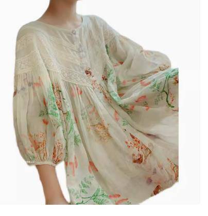 原创夏季日系森女蕾丝碎花宽松大码苎麻衬衫灯笼袖棉麻上衣七分袖