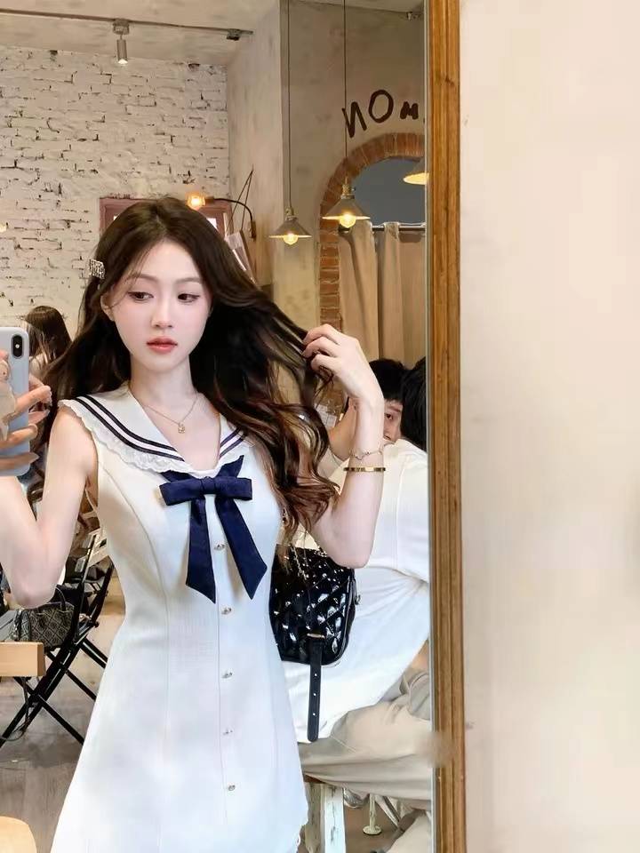 Q女家 漫高艺术生/法式海军领连衣裙夏季甜美学院风减龄无袖裙子