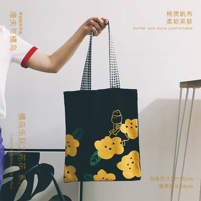 渔夫原创单肩包帆布袋有拉链有内袋黑色港风黄花花少女心田园清新