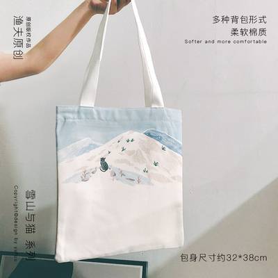 原创插画白色帆布袋大清新雪山猫咪蓝色拉链有内袋单肩手提双用