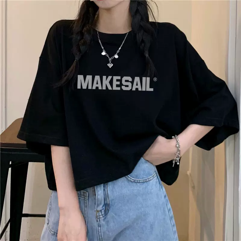 暗系黑色纯棉短款短袖上衣女高腰露脐韩版宽松T恤字母半袖上衣潮