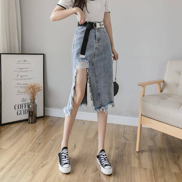 高腰牛仔半身裙女夏季2020新款显瘦ins超火开叉破洞包臀a字裙