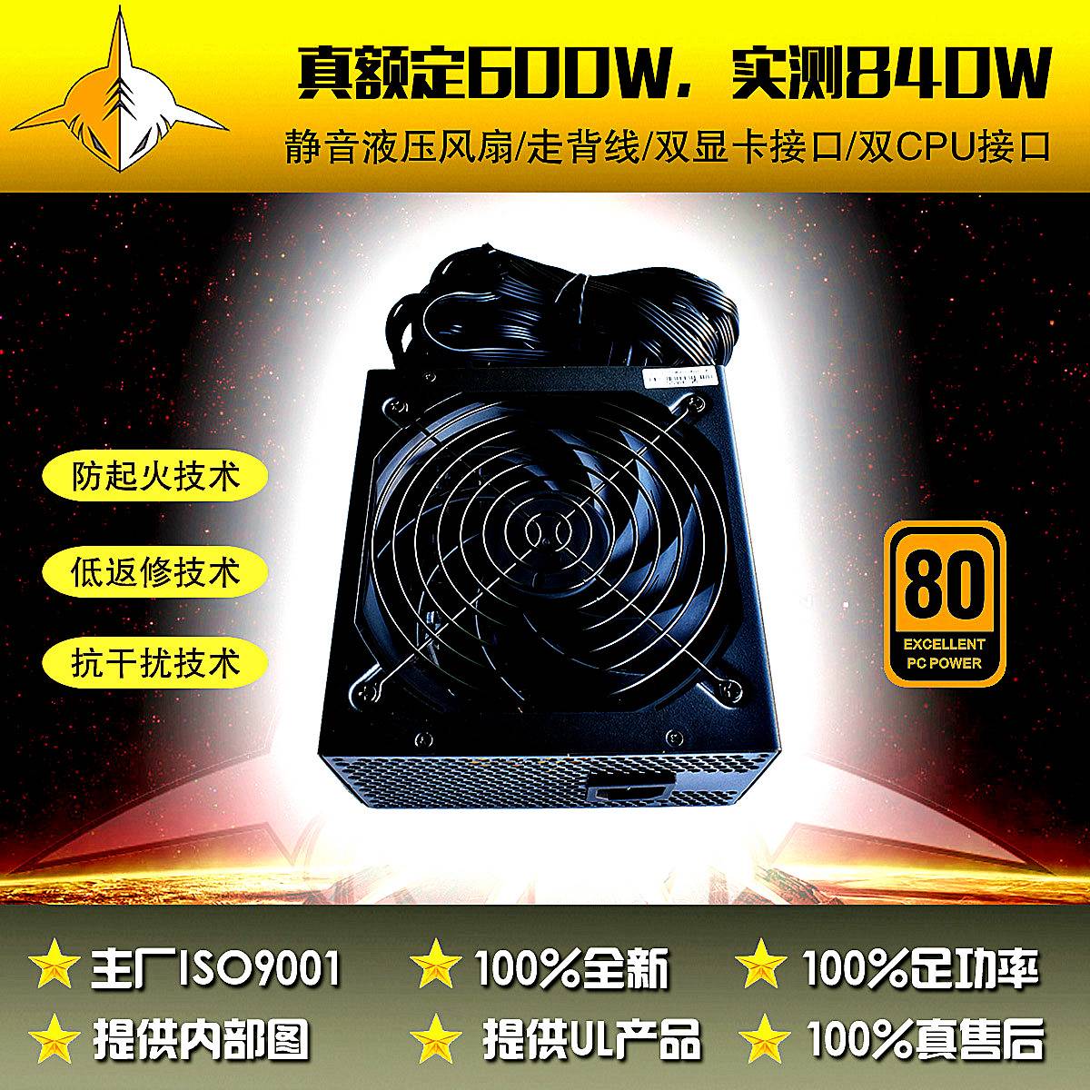 额定600W电源 ATX600W (峰值900W) 黑扁线 防起火游戏电脑电源