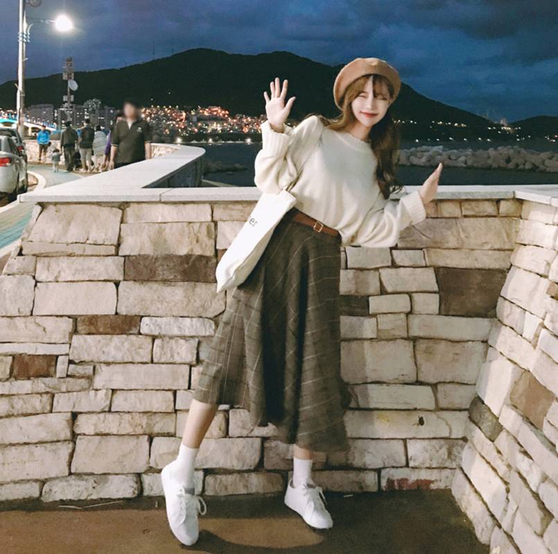 包邮格纹半身裙中长款A字裙秋季ins超火时尚百褶大裙摆裙i