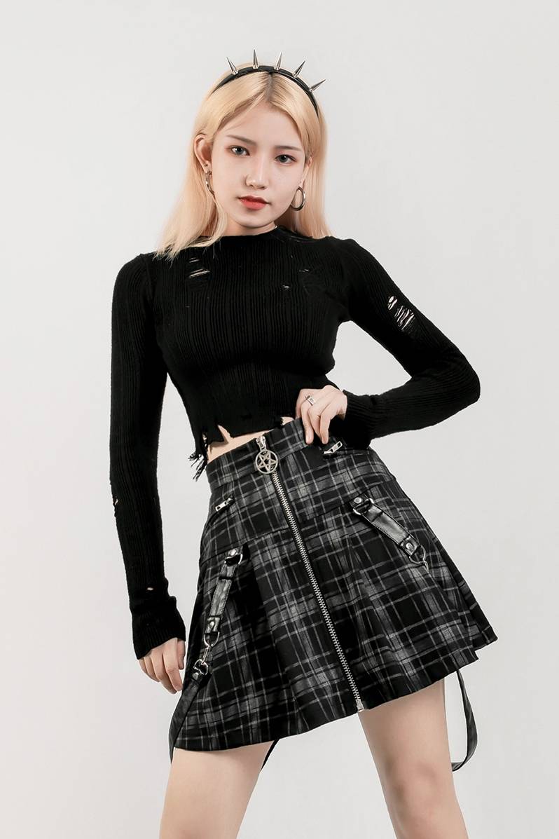 暗黑风朋克可拆卸pu背带装饰金属五芒星拉链格子半裙百褶裙包邮