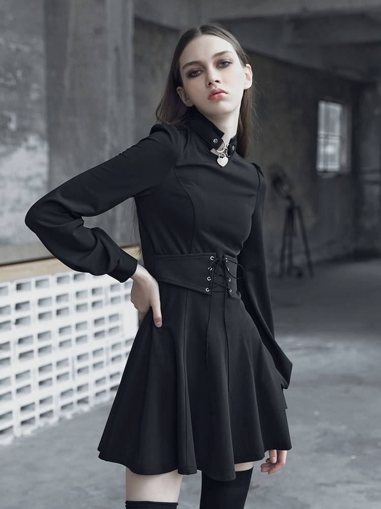 包邮暗黑系复古女装连衣裙2018秋冬新款显瘦长袖高腰小黑裙