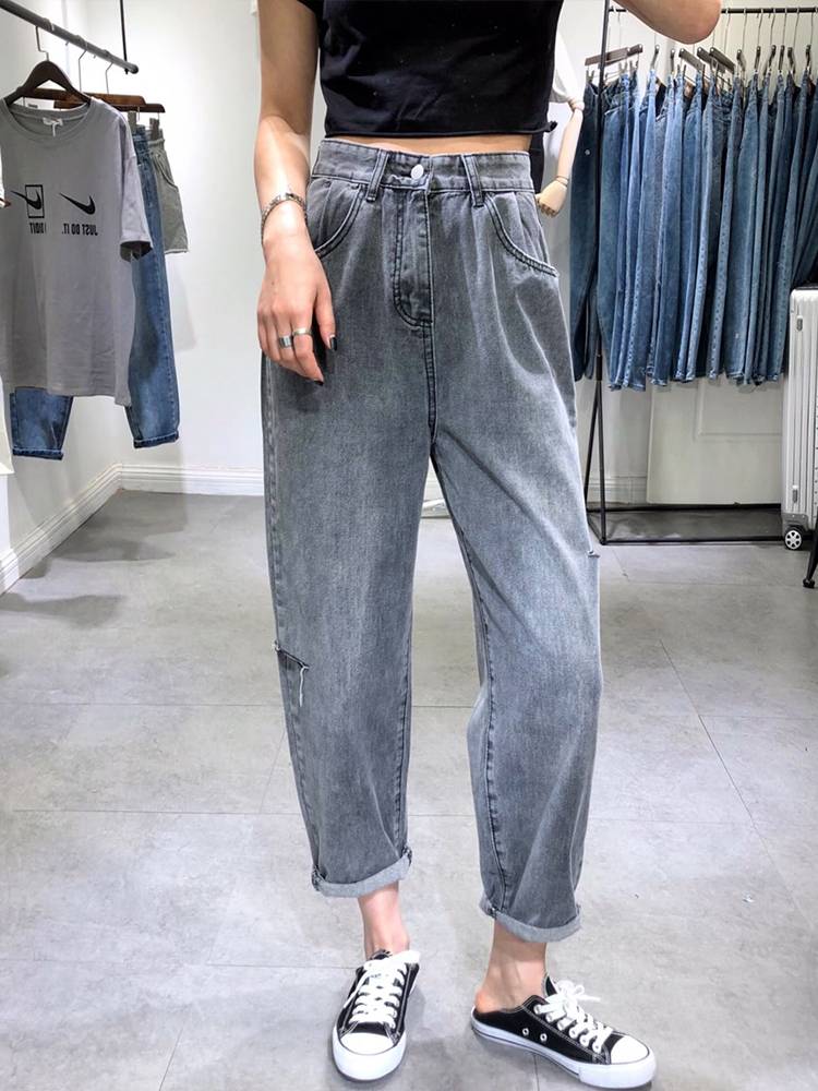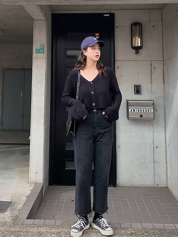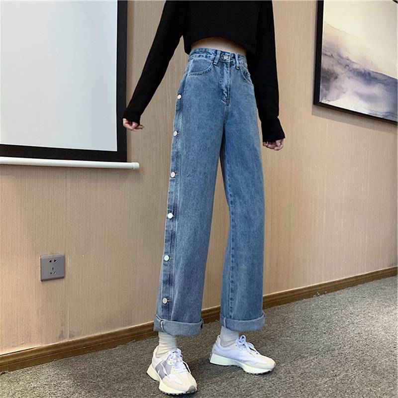 排扣牛仔裤女直筒宽松2021年新款学生显瘦阔腿裤春秋chic百搭裤子