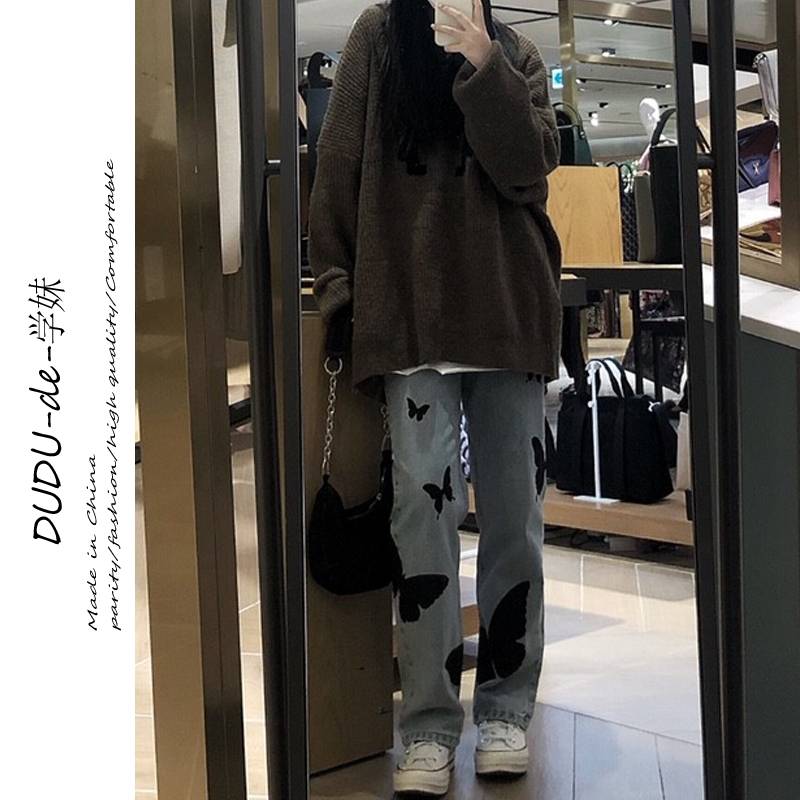 高街头暗黑蝴蝶涂鸦宽松牛仔裤女韩版ins潮流高腰直筒阔腿裤学生