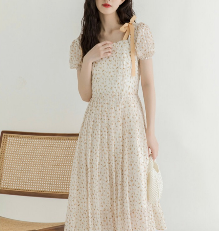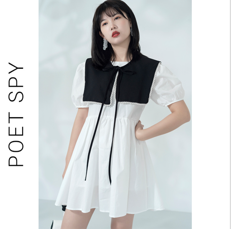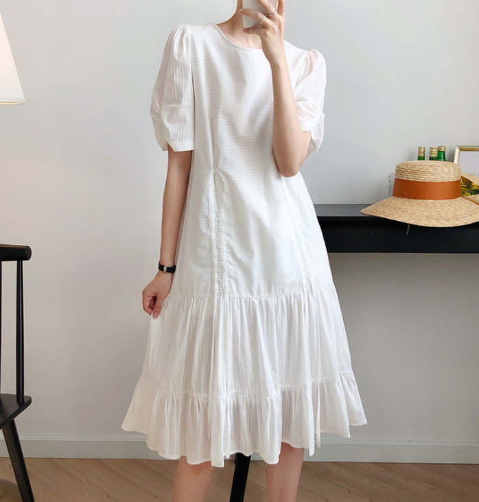 春夏季2021时尚新品温柔风白色宽松中长款短袖气质法式茶歇连衣裙