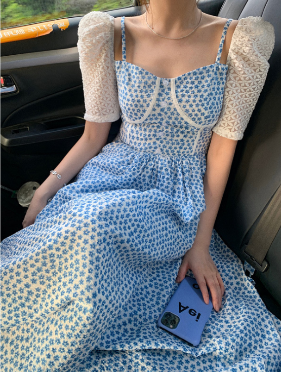 气质法式棉感碎花连衣裙2021夏季短袖高腰印花a字裙超仙的中长裙