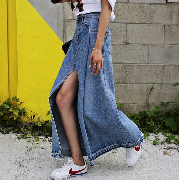 韩国女装2021夏装新款复古做旧毛边牛仔半身裙前开叉长裙潮
