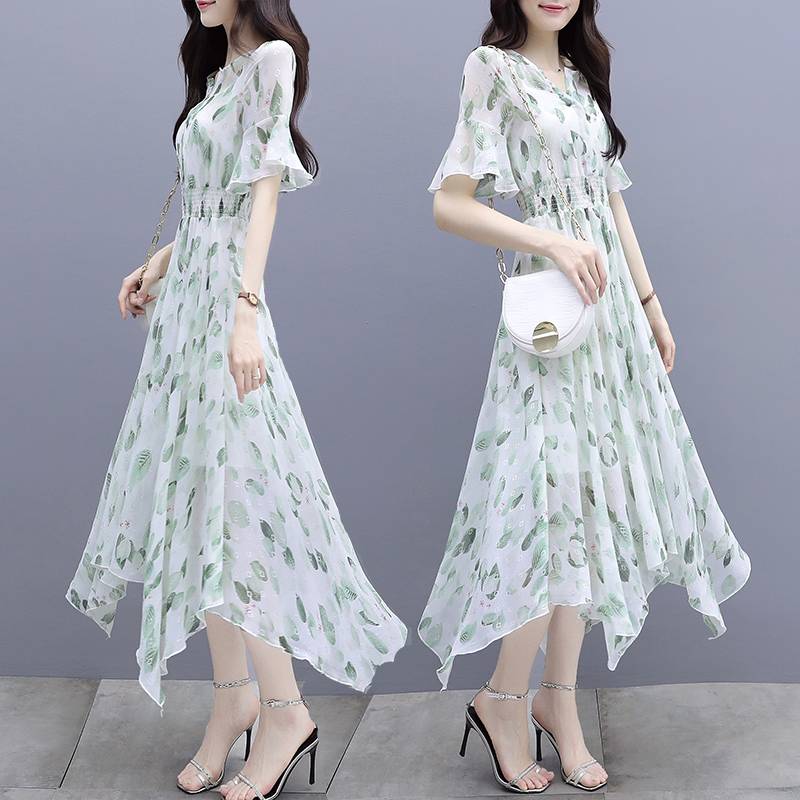 雪纺碎花连衣裙2022新款夏季女士裙子超仙不规则裙摆过膝长裙