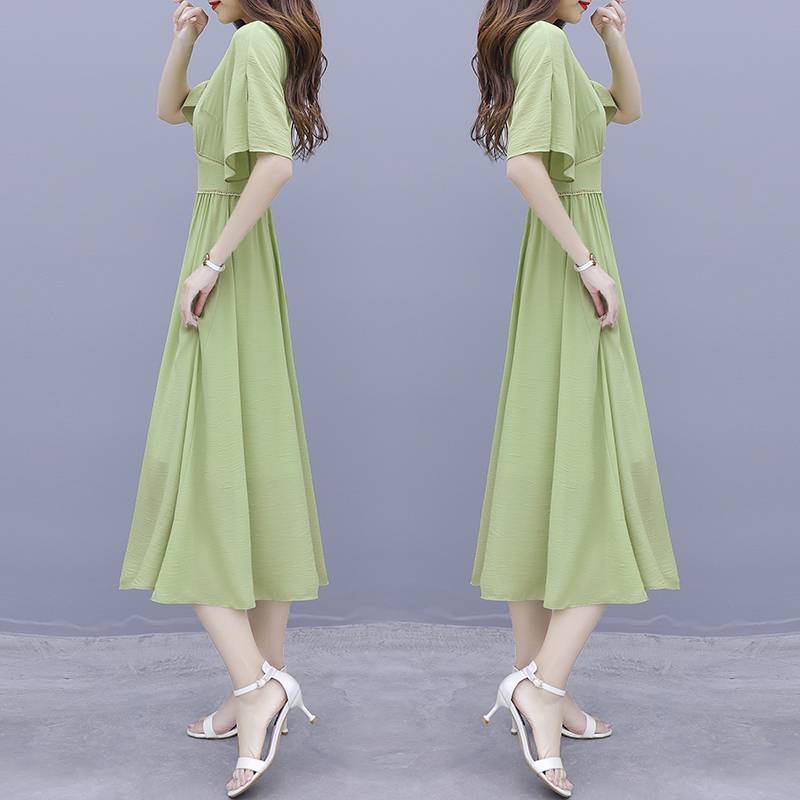 牛油果绿连衣裙女2022年新款夏季收腰显瘦气质甜美中长款雪纺裙子