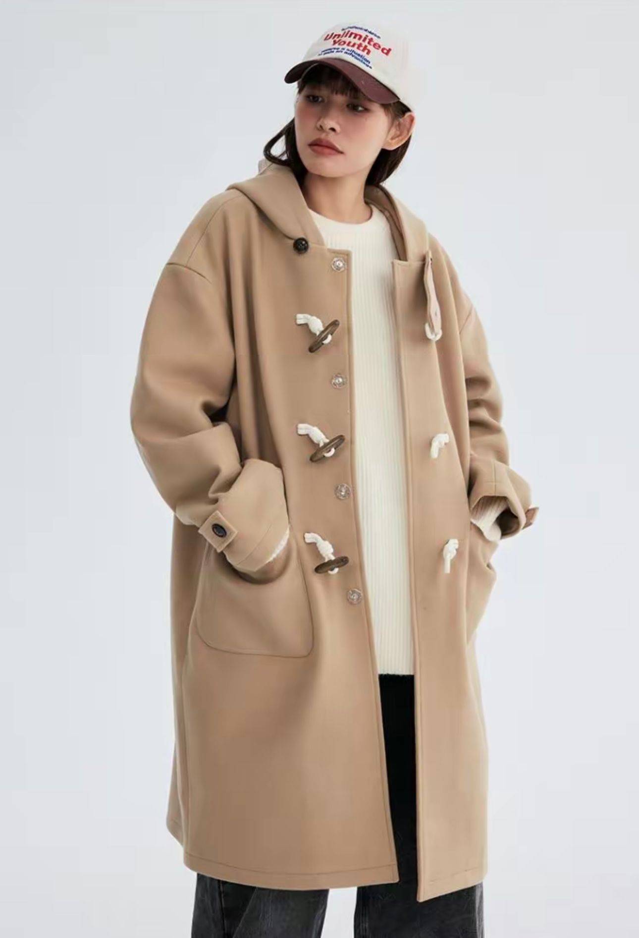 美式复古学院风纯色中长款连帽毛呢大衣秋冬新款